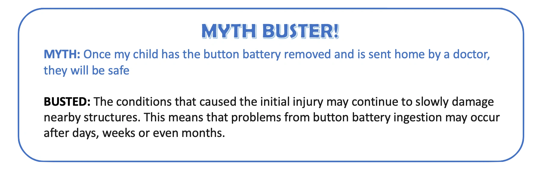 Swallowing button batteries has been linked to many serious injuries, and in some cases, death. Health issues from swallowing button batteries may occur days or months after ingestion, treatment, and discharge from hospital. Knowing the potential health issues may help your child get a quick diagnosis and treatment.
