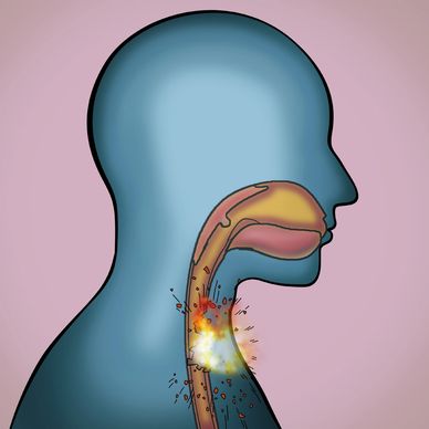 § The vocal cords are in your child’s voice box, which is directly in front of the esophagus. When a button battery sits in the esophagus, it burns and melts the surrounding tissues, which may include the voice box or the nerves that allow the vocal cords to move. This can affect voice and swallowing.